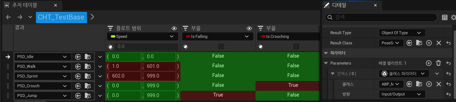 모션 매칭의 내부 분석을 담당한다. 타임 라인의 poseSerach 트랙을 클릭하면 이 창에 상세 정보가 나타난다.