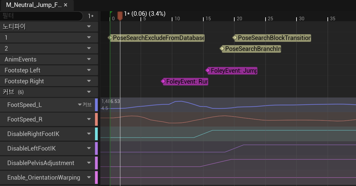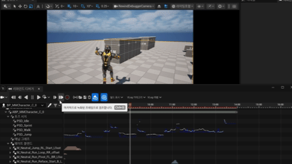- 트랙 시스템: 선택한 캐릭터의 애니메이션 블루프린트, 변수 값, 노티파이(Notify) 등이 타임라인에 표시된다.